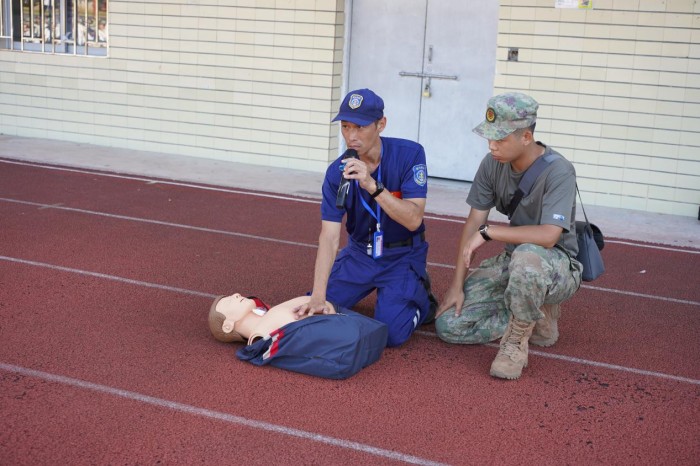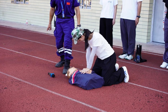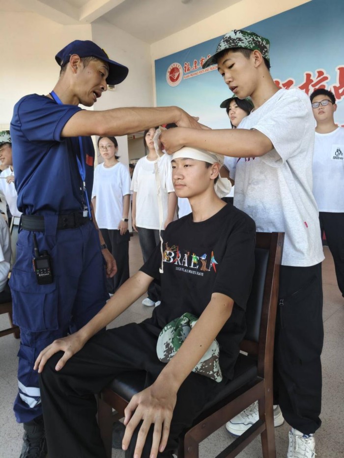 教官们还穿插讲解心肺复苏与中暑处置:通过模拟人演示胸外按压节奏,强调“双手交叠、肩肘垂直”的发力技巧;拆解高温训练中“转移至阴凉处—冰袋冷敷—补充电解质”的科学处置流程。学生们在情景模拟中分组演练,从慌乱到有序,逐步提升应急能力。