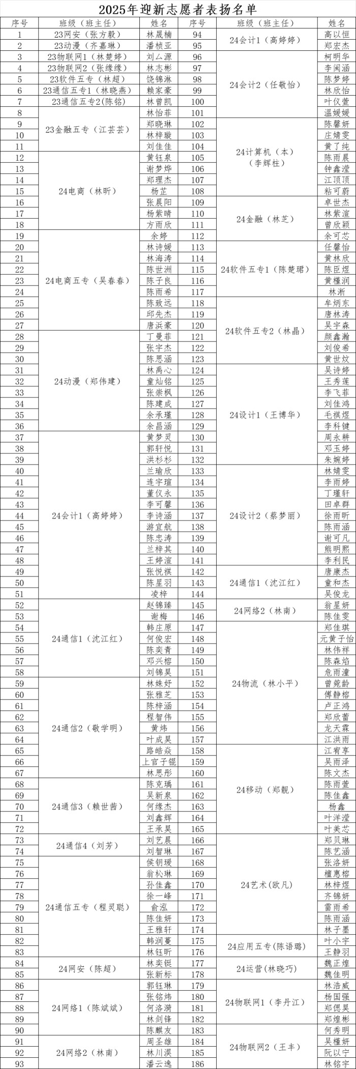 在我校2025年迎新工作中,广大青年志愿者积极投入、热情服务,为迎新工作的顺利开展提供了有力保障。为表彰先进、树立典型,进一步激发全校同学参与志愿服务的积极性,经研究,决定对在迎新工作中表现突出的林晟楠等186名志愿者予以通报表扬。