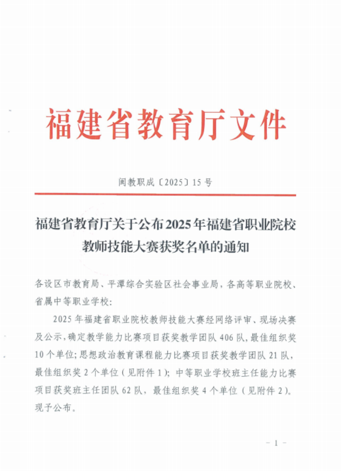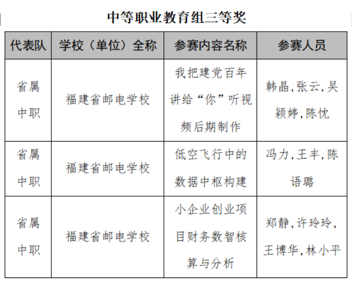 日前,福建省教育厅公布2025年福建省职业院校技能大赛教学能力比赛获奖名单,我校3支参赛团队均获得中等职业教育组三等奖。